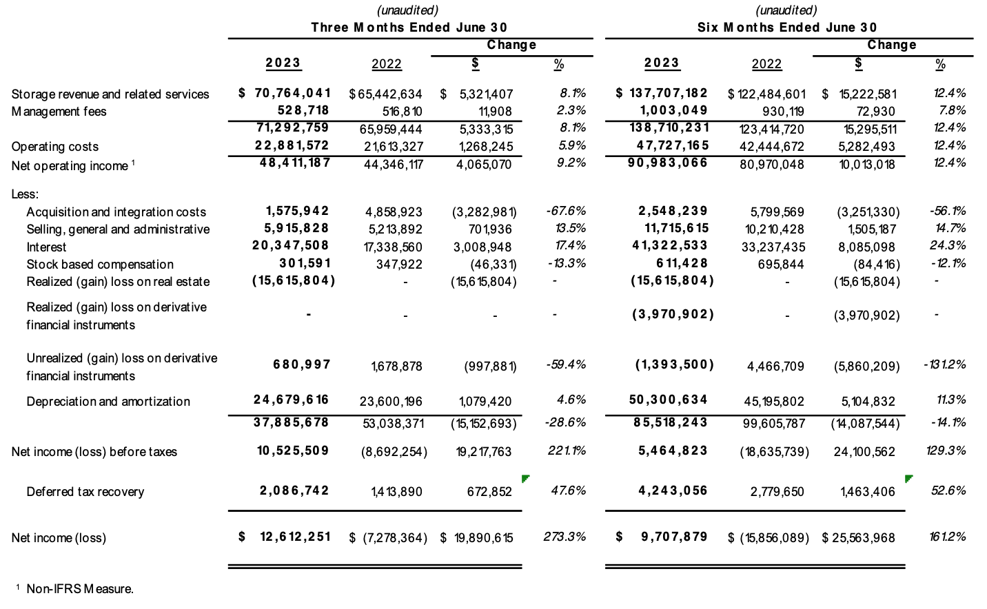Revenue and NOI from Existing Self Storage stores increased by 1.7% and 2.2%, compared to the same period last year. Funds from operations (“FFO”), a non-IFRS measure, were $20.6 million for Q2 2023 compared to $16.9 million in Q2 2022, a 21.5% increase year over year. Adjusted funds from operations (“AFFO”), a non-IFRS measure, were $22.1 million for Q2 2023 compared to $21.8 million in Q2 2022, a 1.6% increase. On a per basic common share basis, FFO and AFFO increased by 21.6% and 1.7%, respectively.